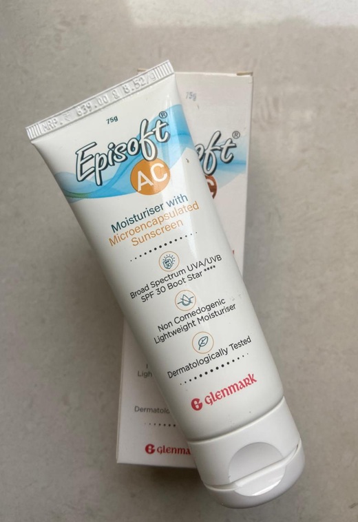 So my search ended with Episoft AC Moisturiser with Microencapsulated SPF 30 Sunscreen by Glenmark Pharmaceuticals. So it is basically a broad spectrum UVA/UVB moisturiser with sunscreen for acne prone skin. It comes in two strengths SPF 30 and SPF 50.
